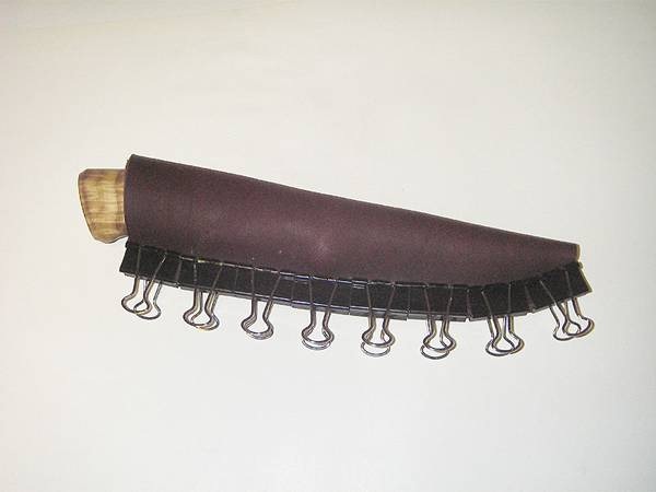 - Pagkatapos ay i-wrap ang kutsilyo gamit ang isang piraso ng katad at ayusin ito sa mga clip sa tabas ng hinaharap na tahi, iwanan ang produkto upang matuyo nang ganap.